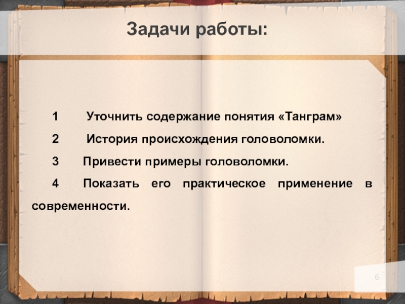 Задачи работы:1    Уточнить содержание понятия «Танграм»2    История происхождения головоломки.3