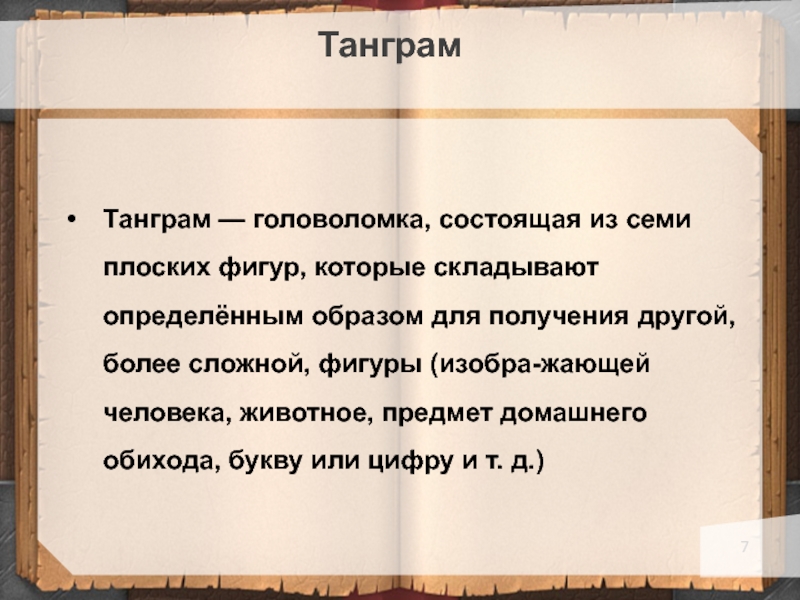 ТанграмТанграм — головоломка, состоящая из семи плоских фигур, которые складывают определённым образом для получения другой, более сложной, фигуры (изобра-жающей человека,
