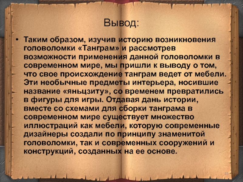Вывод:Таким образом, изучив историю возникновения головоломки «Танграм» и рассмотрев возможности применения данной головоломки в современном мире, мы