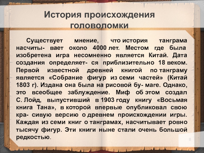 где была изобретена игра несомненно является Китай. Дата создания определяет- ся приблизительно 18 веком. Первой известной древней книгой по танграму является «Собрание фигур из семи частей» (Китай 1803 г). Издана она была на рисовой бу- маге. Однако, это всеобщее заблуждение. Миф об этом создал С. Лойд, выпустивший в 1903 году книгу «Восьмая книга Тана», в которой впервые опубликовал свою кра- сивую версию о древнем происхождении игры. Каждая из семи книг о танграмах, насчитывает ровно тысячу фигур. Эти книги ныне стали очень большой редкостью.