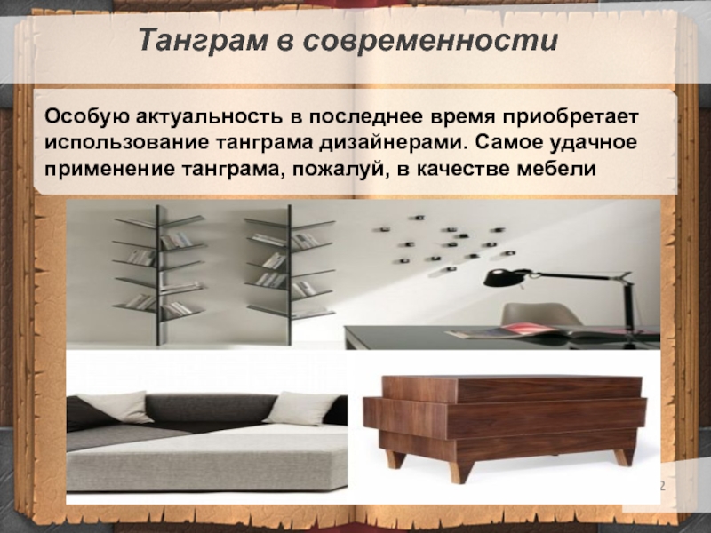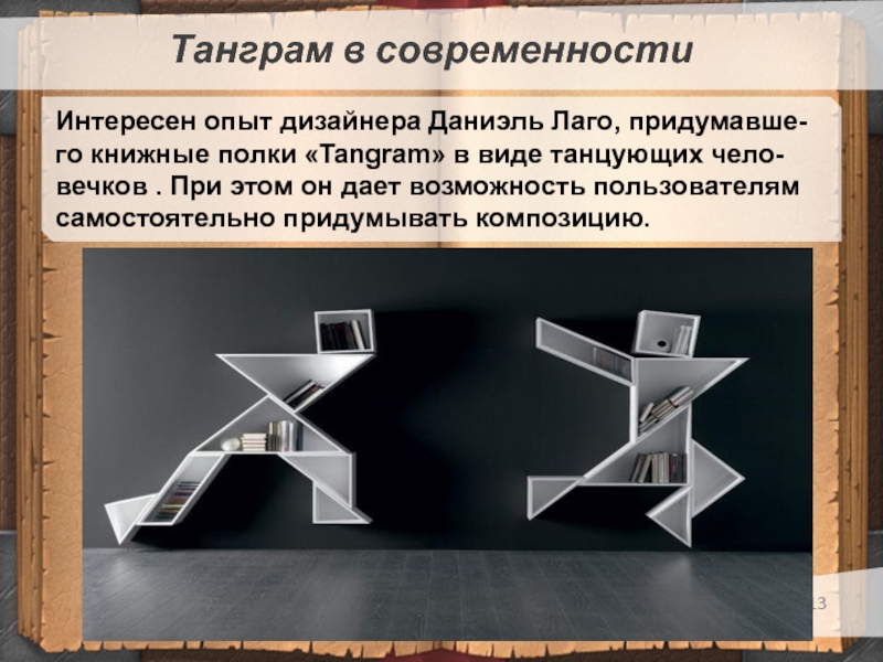 Танграм в современностиИнтересен опыт дизайнера Даниэль Лаго, придумавше-го книжные полки «Tangram» в виде танцующих чело-вечков . При