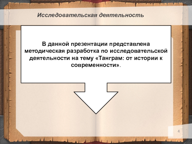 Исследовательская деятельность В данной презентации представлена методическая разработка по исследовательской деятельности на тему «Танграм: от истории к