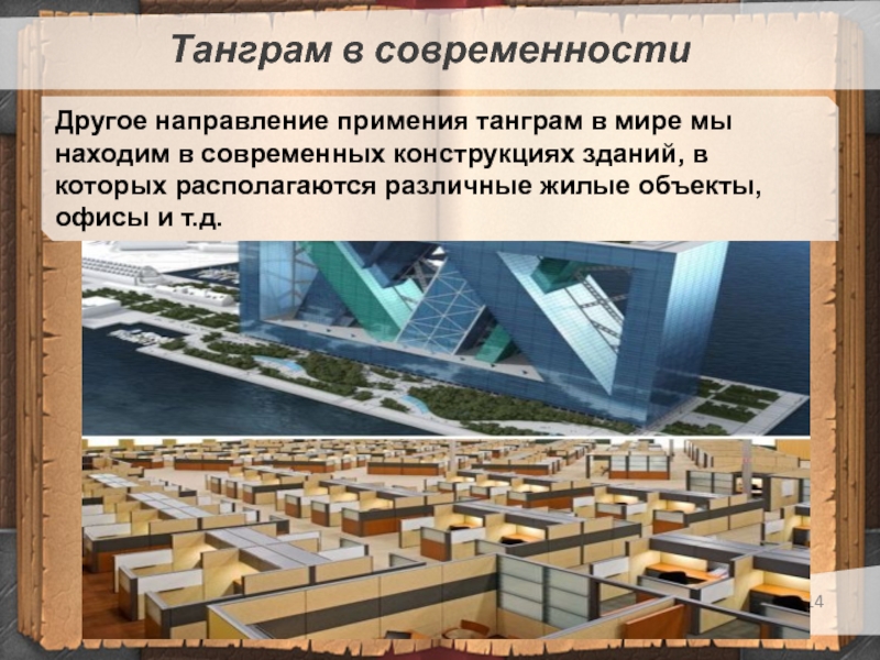 Танграм в современностиДругое направление примения танграм в мире мы находим в современных конструкциях зданий, в которых располагаются