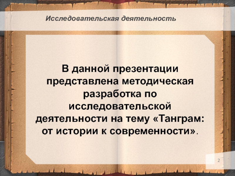 Исследовательская деятельность В данной презентации представлена методическая разработка по исследовательской деятельности на тему «Танграм: от истории к современности».