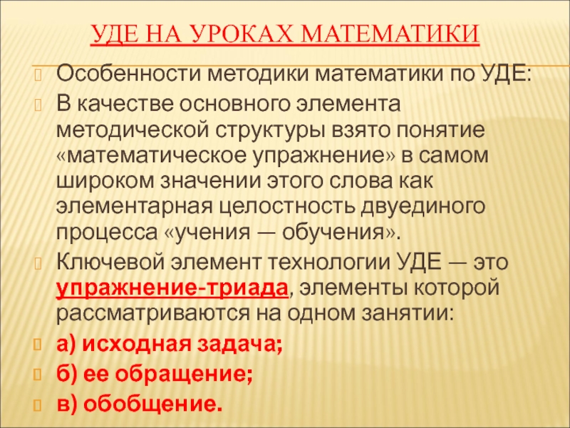 Сущность УДЕ сводится к объединению знаний во времени (урок, лекция) или в пространстве (разворот учебника и тетради). Элементы знания, распределённые ранее по разным разделам и годам обучения, объединяются и образуют тем самым целостный сплав