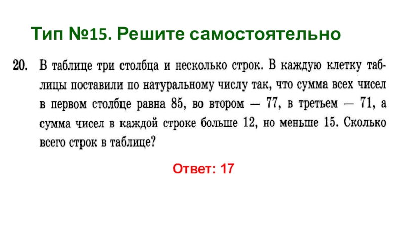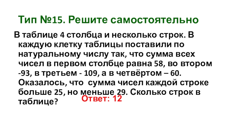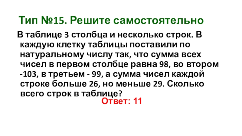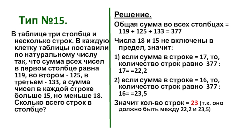 клетку таблицы поставили по натуральному числу так, что сумма всех чисел в первом столбце равна 119, во втором - 125, в третьем - 133, а сумма чисел в каждой строке больше 15, но меньше 18. Сколько всего строк в столбце?