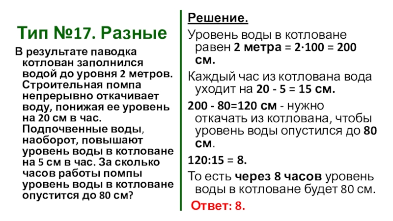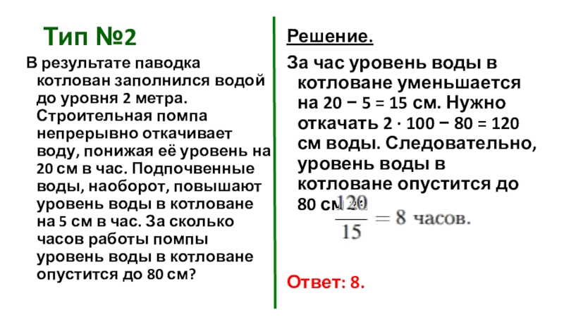 метров. Строительная помпа непрерывно откачивает воду, понижая ее уровень на 20 см в час. Подпочвенные воды, наоборот, повышают уровень воды в котловане на 5 см в час. За сколько часов работы помпы уровень воды в котловане опустится до 80 см?