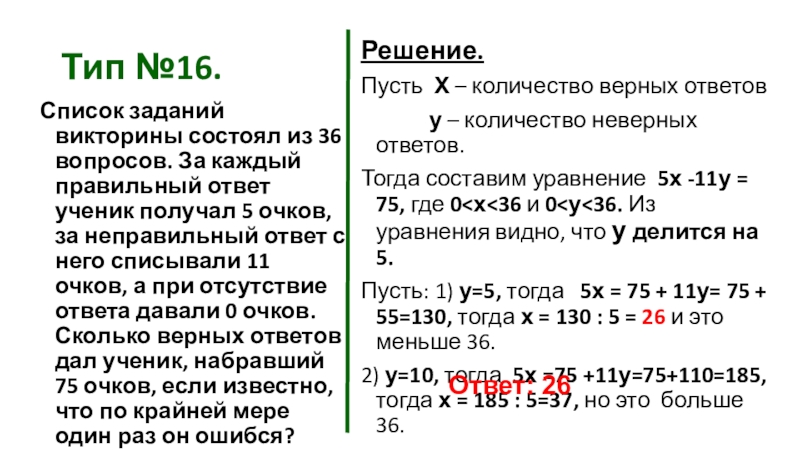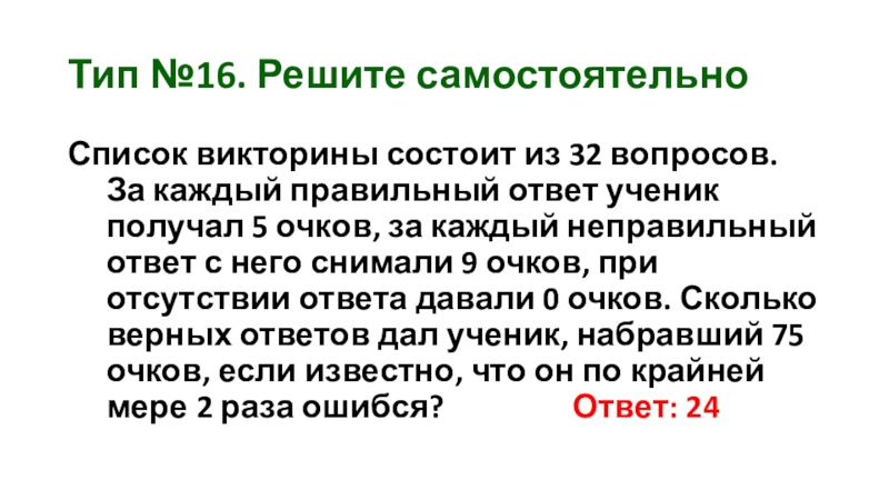 каждый правильный ответ ученик получал 5 очков, за каждый неправильный ответ с него снимали 9 очков, при отсутствии ответа давали 0 очков. Сколько верных ответов дал ученик, набравший 75 очков, если известно, что он по крайней мере 2 раза ошибся? Ответ: 24