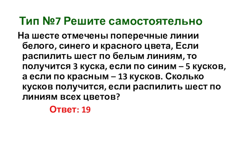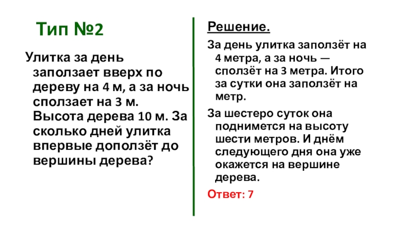 а за ночь сползает на 3 м. Высота дерева 10 м. За сколько дней улитка впервые доползёт до вершины дерева?