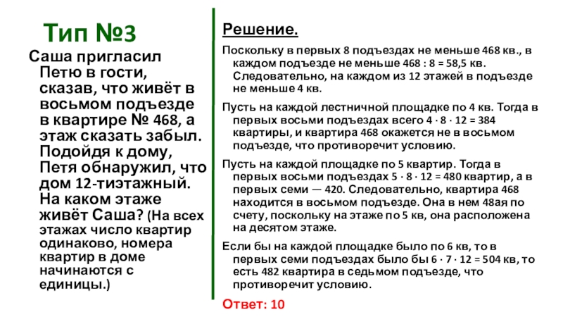 Поскольку в первых 8 подъездах не меньше 468 кв., в каждом подъезде не меньше 468 : 8 = 58,5 кв. Следовательно, на каждом из 12 этажей в подъезде не меньше 4 кв.