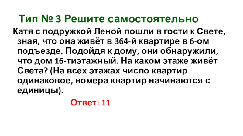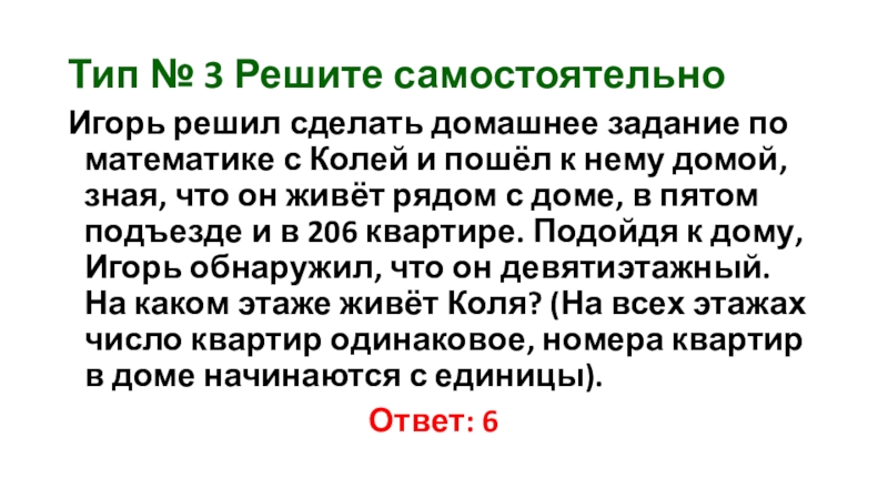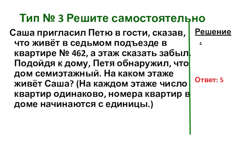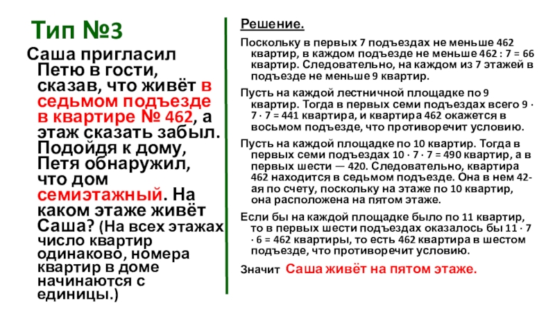 подъезде в квартире № 462, а этаж сказать забыл. Подойдя к дому, Петя обнаружил, что дом семиэтажный. На каком этаже живёт Саша? (На всех этажах число квартир одинаково, номера квартир в доме начинаются с единицы.)