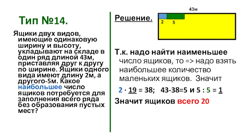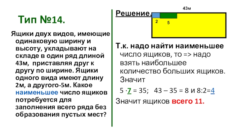 складе в один ряд длиной 43м, приставляя друг к другу по ширине. Ящики одного вида имеют длину 2м, а другого-5м. Какое наименьшее число ящиков потребуется для заполнения всего ряда без образования пустых мест?