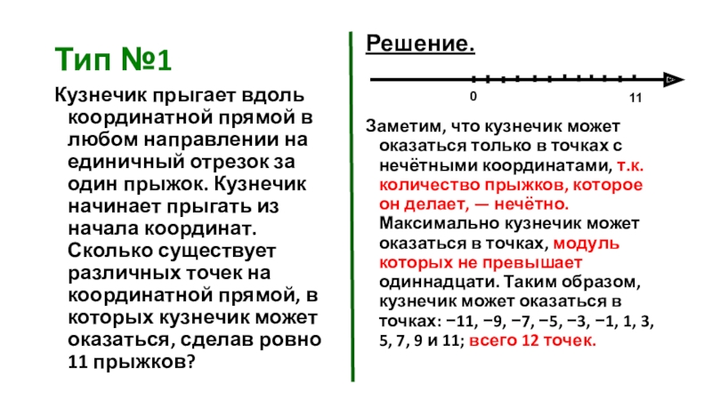 Заметим, что кузнечик может оказаться только в точках с нечётными координатами, т.к. количество прыжков, которое он делает, — нечётно. Максимально кузнечик может оказаться в точках, модуль которых не превышает одиннадцати. Таким образом, кузнечик может оказаться в точках: −11, −9, −7, −5, −3, −1, 1, 3, 5, 7, 9 и 11; всего 12 точек.
