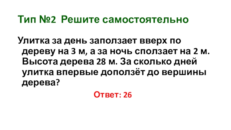 3 м, а за ночь сползает на 2 м. Высота дерева 28 м. За сколько дней улитка впервые доползёт до вершины дерева?