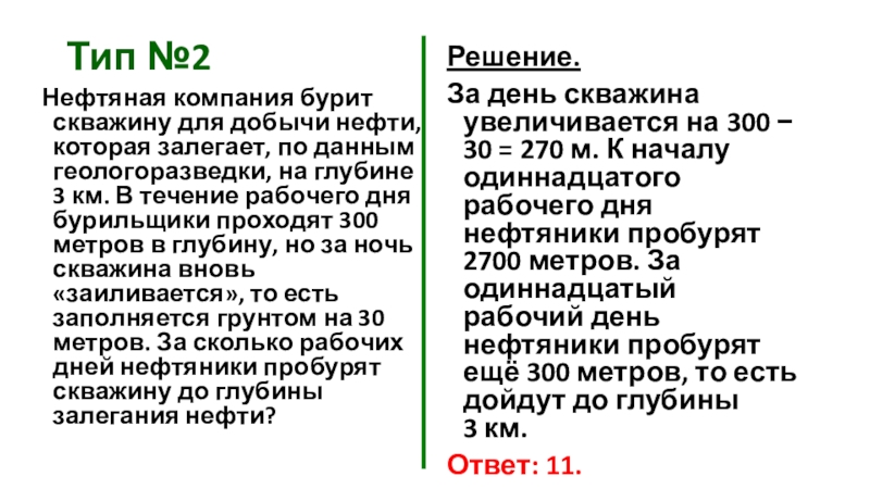 данным геологоразведки, на глубине 3 км. В течение рабочего дня бурильщики проходят 300 метров в глубину, но за ночь скважина вновь «заиливается», то есть заполняется грунтом на 30 метров. За сколько рабочих дней нефтяники пробурят скважину до глубины залегания нефти?