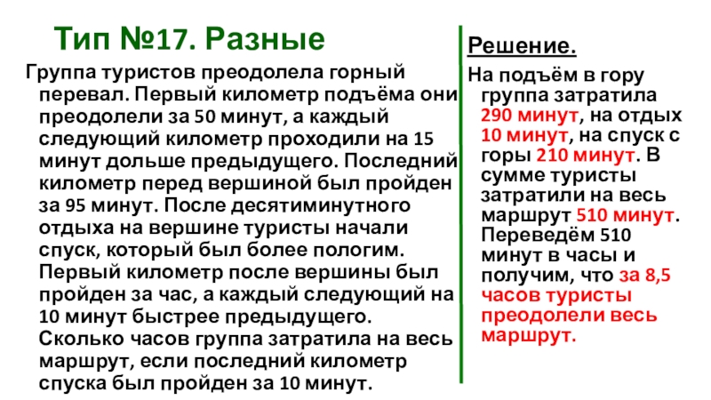 На подъём в гору группа затратила 290 минут, на отдых 10 минут, на спуск с горы 210 минут. В сумме туристы затратили на весь маршрут 510 минут. Переведём 510 минут в часы и получим, что за 8,5 часов туристы преодолели весь маршрут.