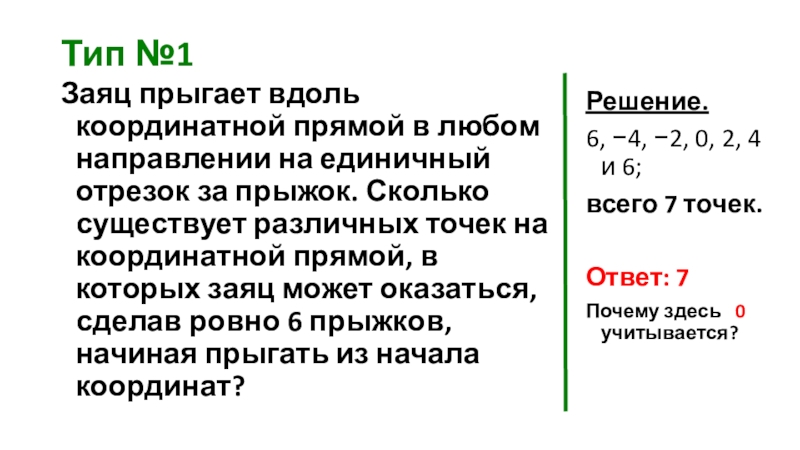 отрезок за прыжок. Сколько существует различных точек на координатной прямой, в которых заяц может оказаться, сделав ровно 6 прыжков, начиная прыгать из начала координат?