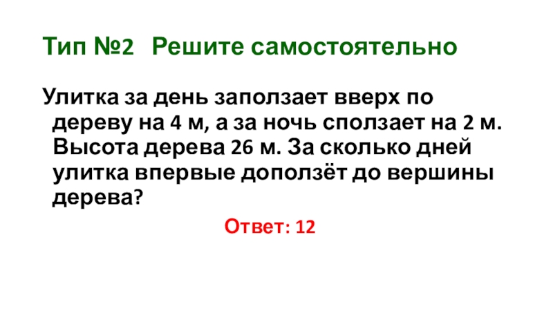 на 4 м, а за ночь сползает на 2 м. Высота дерева 26 м. За сколько дней улитка впервые доползёт до вершины дерева?