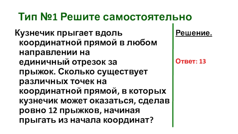 на единичный отрезок за прыжок. Сколько существует различных точек на координатной прямой, в которых кузнечик может оказаться, сделав ровно 12 прыжков, начиная прыгать из начала координат?