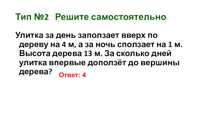 на 4 м, а за ночь сползает на 1 м. Высота дерева 13 м. За сколько дней улитка впервые доползёт до вершины дерева?