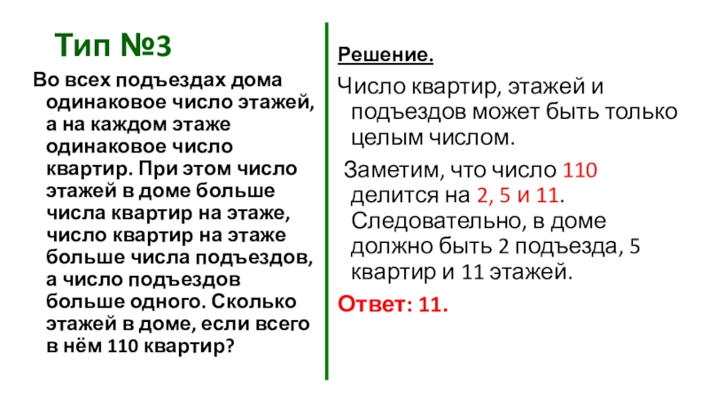 Заметим, что число 110 делится на 2, 5 и 11. Следовательно, в доме должно быть 2 подъезда, 5 квартир и 11 этажей.
