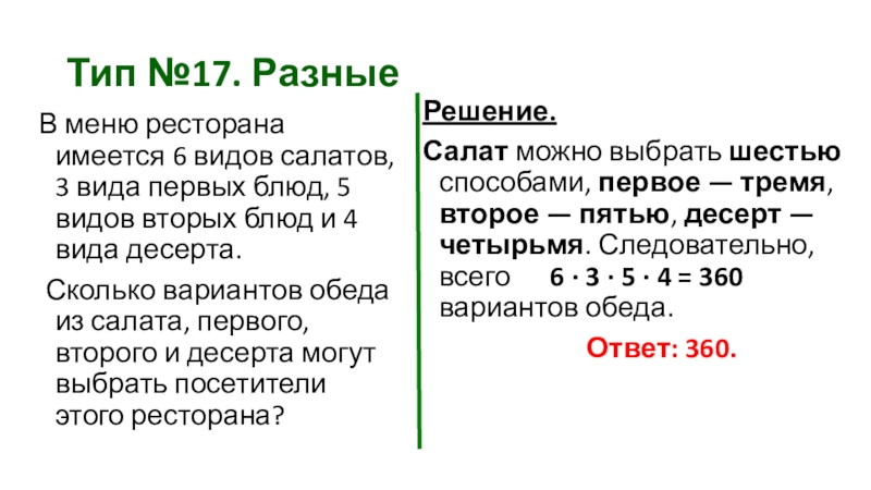 Салат можно выбрать шестью способами, первое — тремя, второе — пятью, десерт — четырьмя. Следовательно, всего 6 · 3 · 5 · 4 = 360 вариантов обеда.
