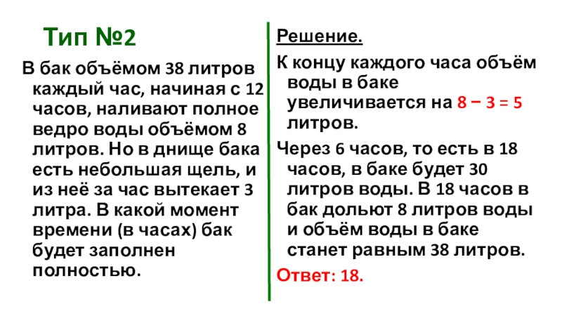 часов, наливают полное ведро воды объёмом 8 литров. Но в днище бака есть небольшая щель, и из неё за час вытекает 3 литра. В какой момент времени (в часах) бак будет заполнен полностью.