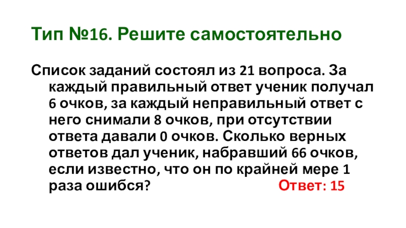 каждый правильный ответ ученик получал 6 очков, за каждый неправильный ответ с него снимали 8 очков, при отсутствии ответа давали 0 очков. Сколько верных ответов дал ученик, набравший 66 очков, если известно, что он по крайней мере 1 раза ошибся? Ответ: 15