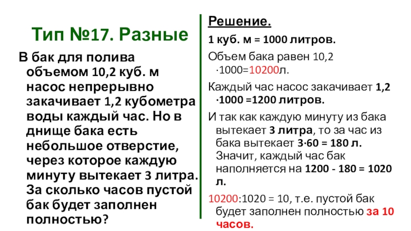непрерывно закачивает 1,2 кубометра воды каждый час. Но в днище бака есть небольшое отверстие, через которое каждую минуту вытекает 3 литра. За сколько часов пустой бак будет заполнен полностью?