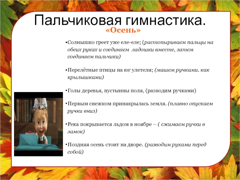 Солнышко греет уже еле-еле; (растопыриваем пальцы на обеих руках и соединяем ладошки вместе, затем соединяем пальчики)