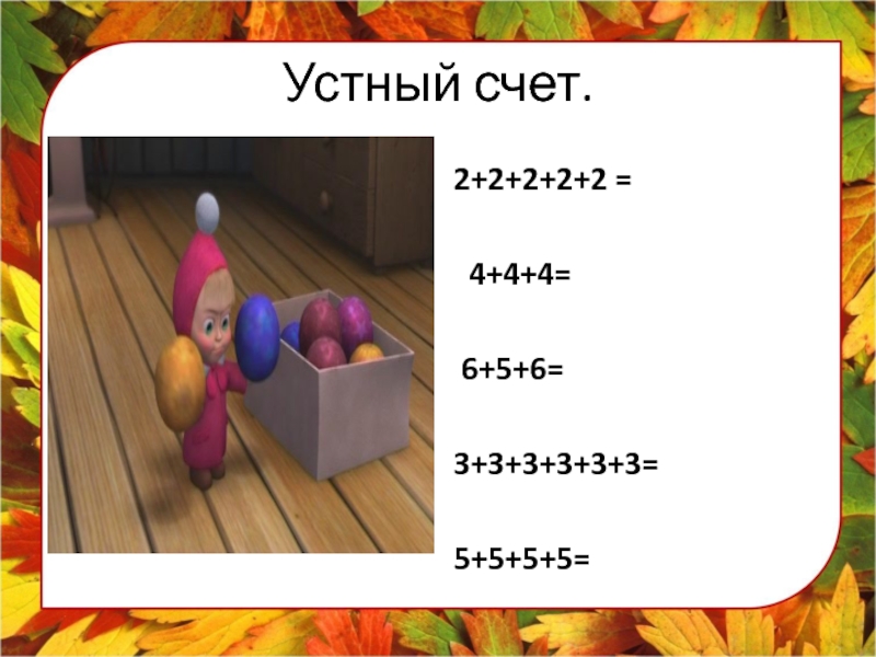 Устный счет.2+2+2+2+2 = 4+4+4=      6+5+6=3+3+3+3+3+3=