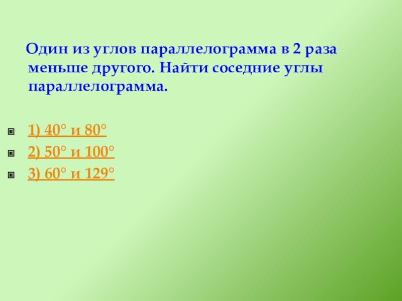 Слайд 17Найти соседние углы параллелограмма, если сумма двух углов равна 160°.