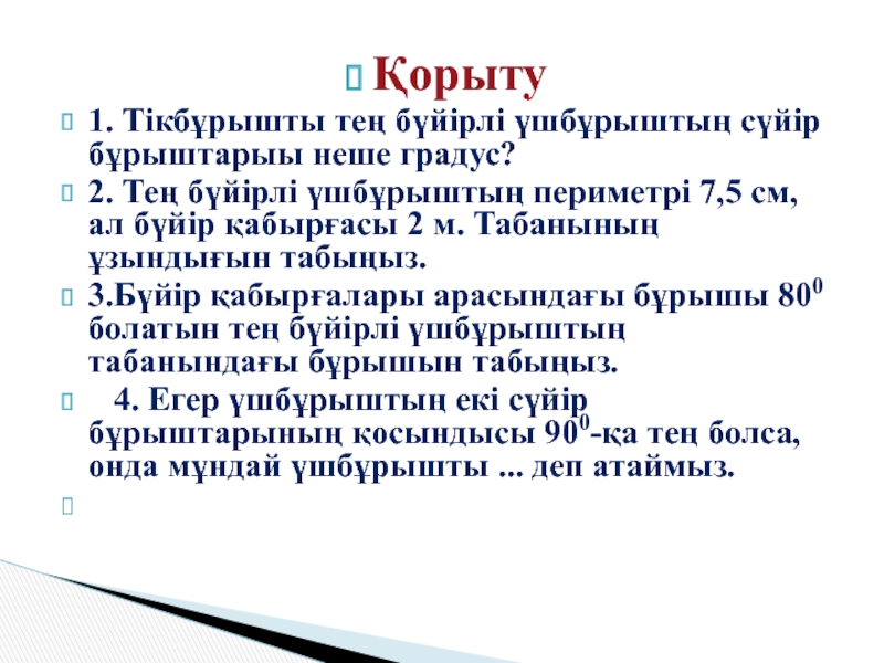 Қорыту 1. Тікбұрышты тең бүйірлі үшбұрыштың сүйір бұрыштарыы неше градус? 2. Тең бүйірлі үшбұрыштың периметрі 7,5 см,