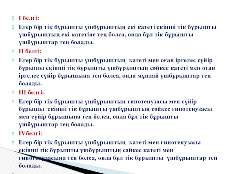 І белгі:Егер бір тік бұрышты үшбұрыштың екі катеті екінші тік бұрышты үшбұрыштың екі катетіне тең болса, онда бұл тік бұрышты үшбұрыштар тең болады.ІІ белгі:Егер бір тік бұрышты үшбұрыштың катеті мен оған іргелес сүйір бұрышы екінші тік