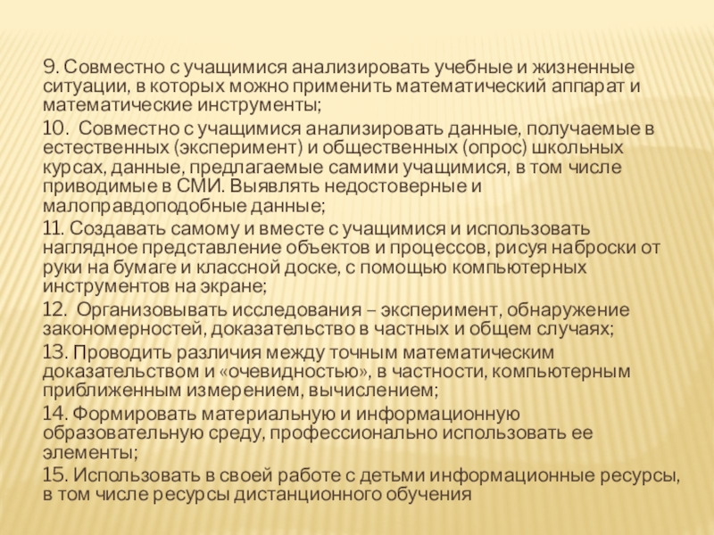 6. Сотрудничать с другими преподавателями математики и информатики, с преподавателями физики, экономики, языка и др., уметь выполнять задания этих предметов;