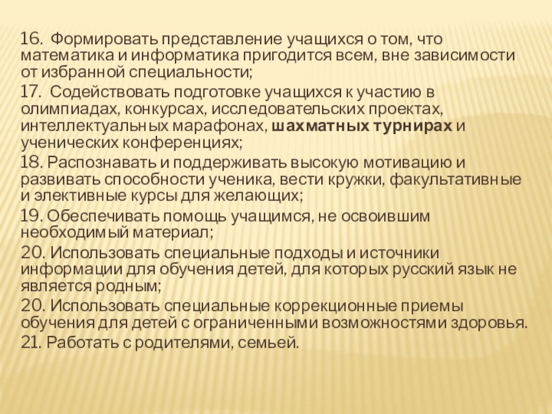 18. Распознавать и поддерживать высокую мотивацию и развивать способности ученика, вести кружки, факультативные и элективные курсы для желающих;
