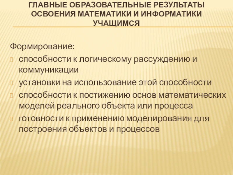 Слайд 2Главные образовательные результаты освоения математики и информатики учащимся
