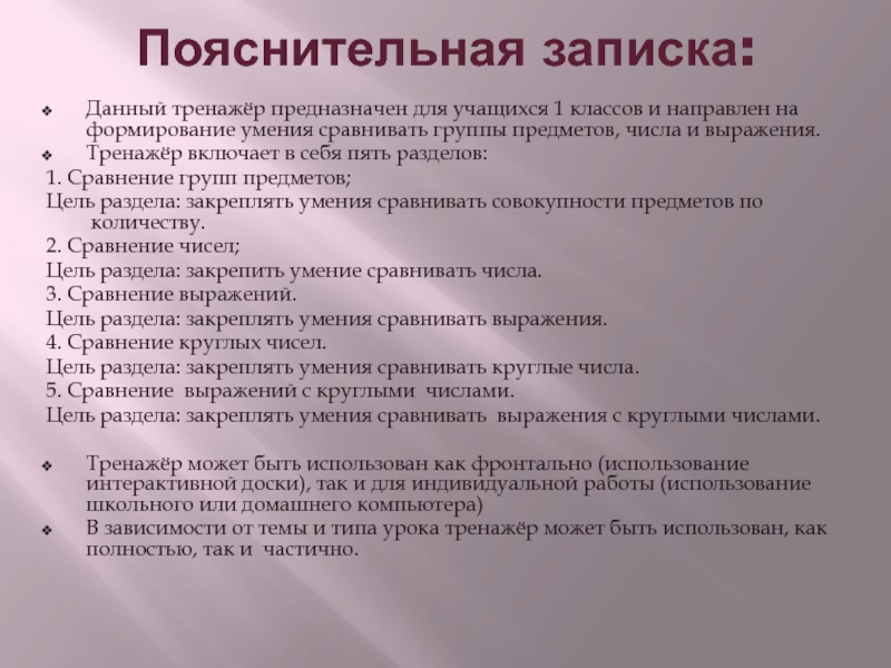 Пояснительная записка:Данный тренажёр предназначен для учащихся 1 классов и направлен на формирование умения сравнивать группы предметов, числа и выражения. Тренажёр включает в себя пять разделов:1. Сравнение групп предметов;Цель раздела: закреплять умения сравнивать совокупности предметов по количеству.2.