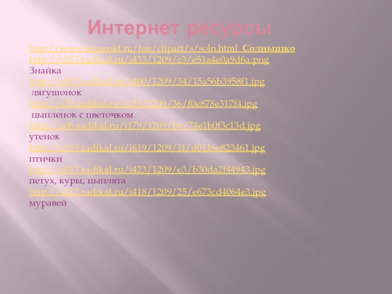 Интернет ресурсыhttp://www.lenagold.ru/fon/clipart/s/soln.html Солнышко http://s017.radikal.ru/i433/1209/c3/e51a4e0a9d6a.png Знайкаhttp://s017.radikal.ru/i400/1209/34/15a56b3958f1.jpg лягушонокhttp://s52.radikal.ru/i135/1209/36/f0e878e317f4.jpg цыпленок с цветочкомhttp://s06.radikal.ru/i179/1209/b6/74e1b0f3c13d.jpg утенокhttp://s019.radikal.ru/i619/1209/1f/d0116e823461.jpg птичкиhttp://s017.radikal.ru/i423/1209/e3/b30da2f44943.jpg петух, куры, цыплятаhttp://s017.radikal.ru/i418/1209/25/e673cd4064e3.jpg муравей