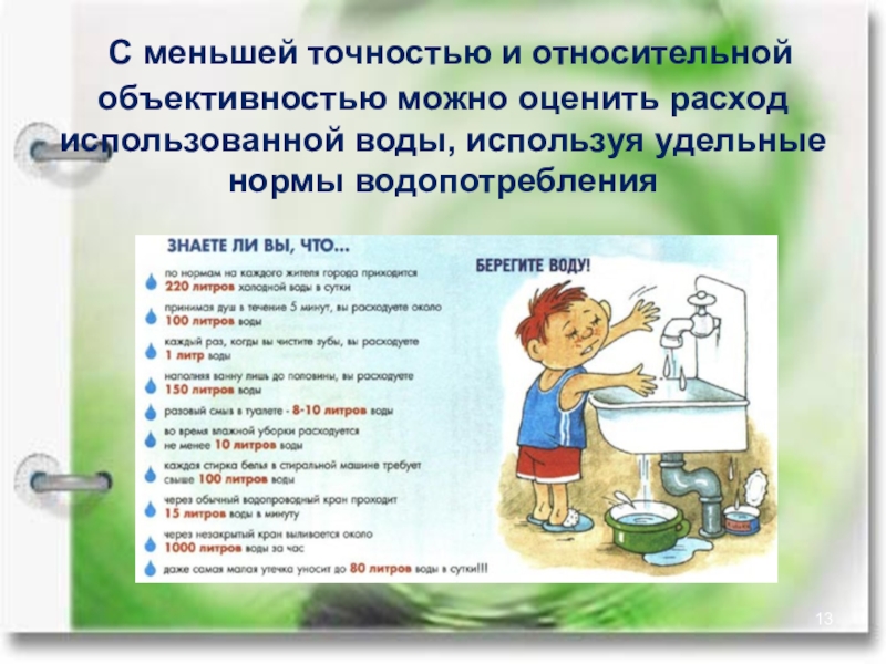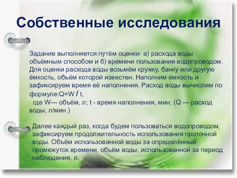 Далее каждый раз, когда будем пользоваться водопроводом, зафиксируем продолжительность использования проточной воды. Объём использованной воды за определённый промежуток времени, объём воды, использованной за период наблюдения, л.