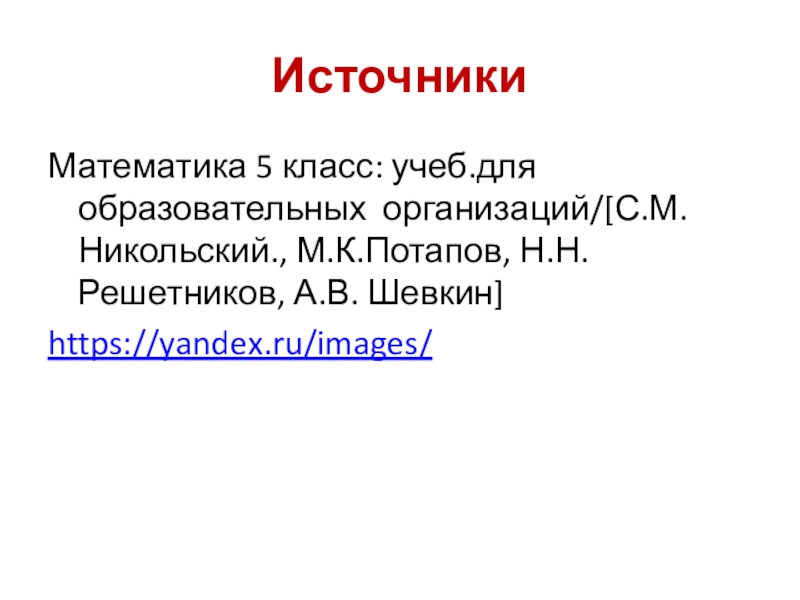 ИсточникиМатематика 5 класс: учеб.для образовательных организаций/[С.М.Никольский., М.К.Потапов, Н.Н.Решетников, А.В. Шевкин]https://yandex.ru/images/