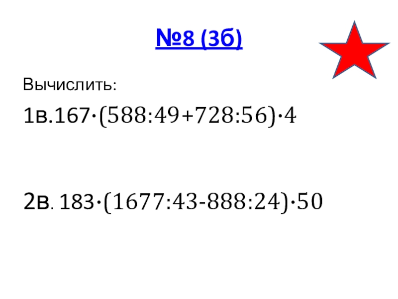 №8 (3б)Вычислить:1в.167·(588:49+728:56)·42в. 183·(1677:43-888:24)·50