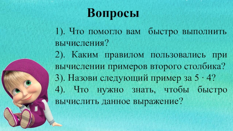 Вопросы1). Что помогло вам быстро выполнить вычисления? 2). Каким правилом пользовались при вычислении примеров второго столбика?3). Назови