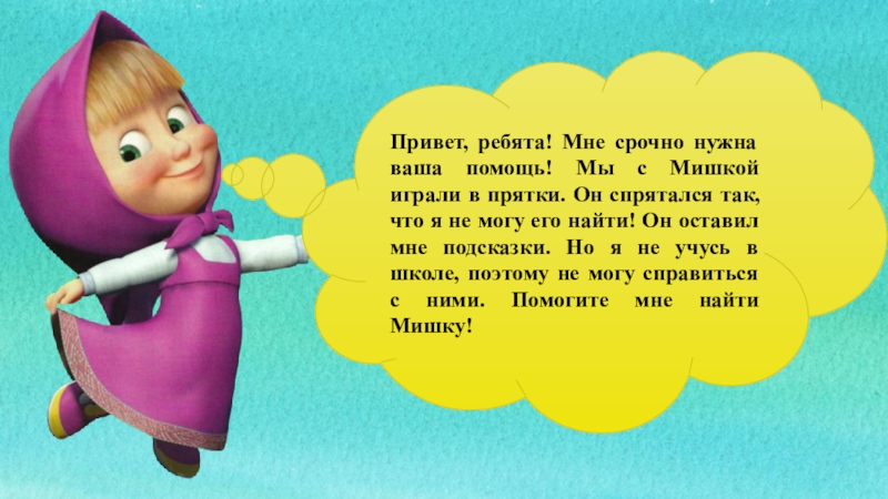 Привет, ребята! Мне срочно нужна ваша помощь! Мы с Мишкой играли в прятки. Он спрятался так, что я не могу его найти! Он оставил мне подсказки. Но я не учусь в школе, поэтому не могу справиться