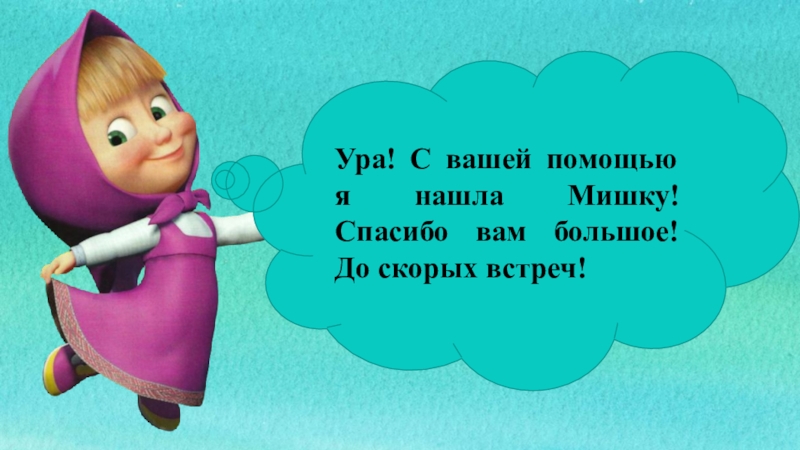 Слайд 23Ура! С вашей помощью я нашла Мишку! Спасибо вам большое! До