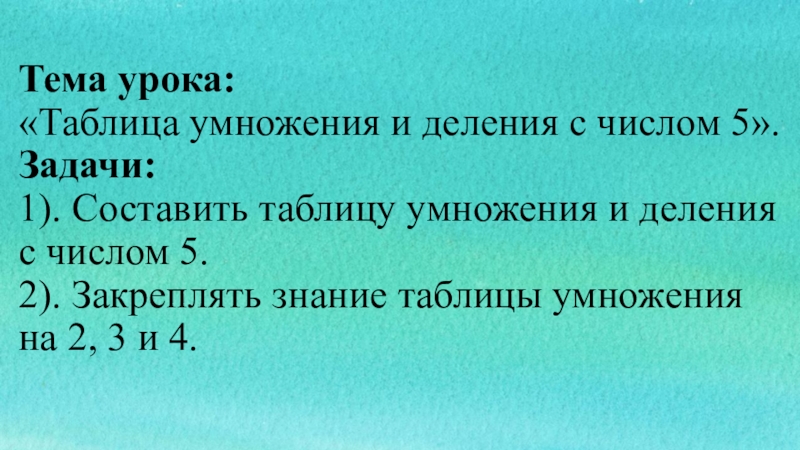 Слайд 6Тема урока: «Таблица умножения и деления с числом 5». Задачи: 1). Составить таблицу умножения