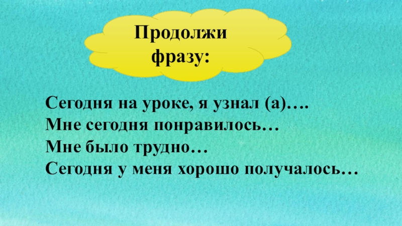 Продолжи фразу:Сегодня на уроке, я узнал (а)….Мне сегодня понравилось…Мне было трудно…Сегодня у меня хорошо получалось…