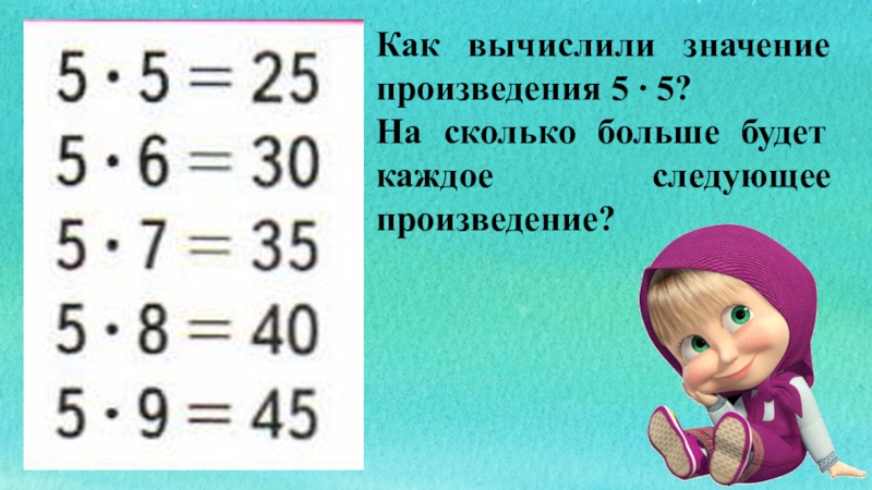 Как вычислили значение произведения 5 ∙ 5?На сколько больше будет каждое следующее произведение?