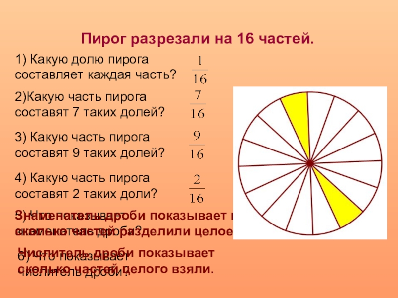 Знаменатель дроби показывает на сколько частей разделили целое.