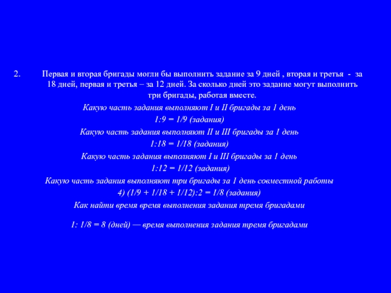 дней , вторая и третья - за 18 дней, первая и третья – за 12 дней. За сколько дней это задание могут выполнить три бригады, работая вместе.